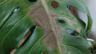 モンステラに水をあげるために ベランダに出したら 日光の強さに 日焼けしてしまい こんな状態になってしまった